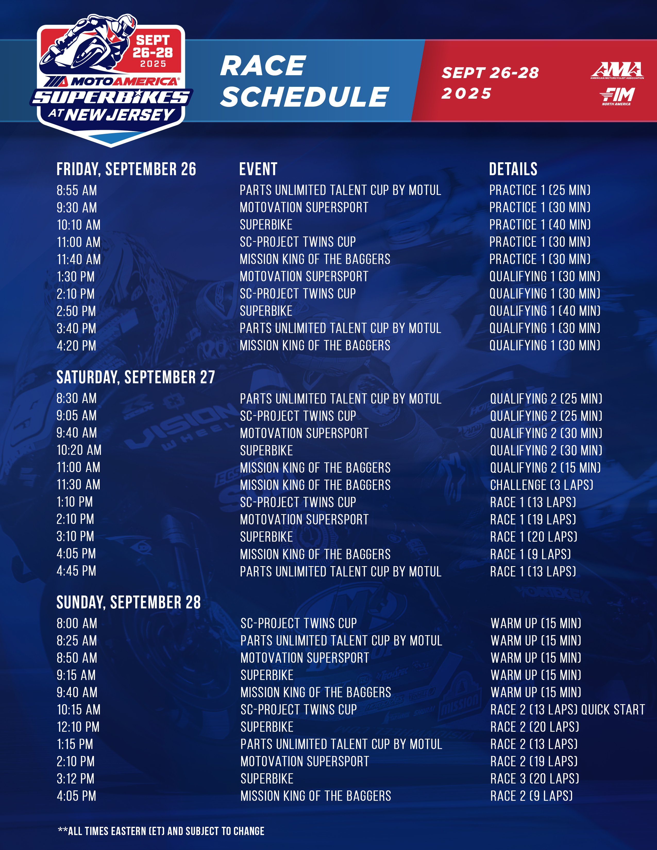 How about 190 mph Superbikes and some family fun? MotoAmerica Superbikes at New Jersey is coming Sept 25-27, 2026. Enjoy practice and qualifying on Friday plus all-day racing Saturday & Sunday. Five classes of road racing will compete, including Superbike, Motovation Supersport, Parts Unlimited Talent Cup By Motul, Mission King Of The Baggers, and SC-Project Twins Cup. Meet the riders in our open race paddock. VIP and camping access packages available. Kids under 12 are admitted free with a paying adult. Bring the family for our Kids Zone, free carnival games, Stunt Show, and Bike Show.